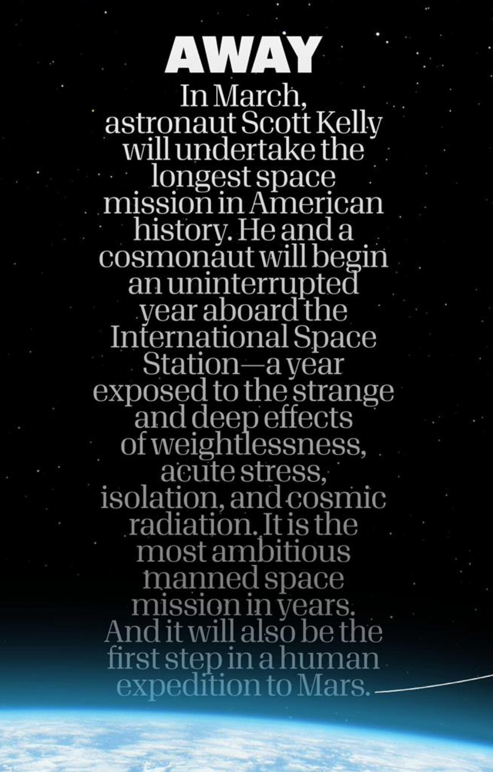 The series is about the first manned flight to Mars. Jones is a writer on the show because he wrote the magazine piece that inspired it, also titled “Away” from the December 2014 issue of Esquire. It was all about Scott Kelly and his record-setting stay on the International Space Station; it last 340 days (the longest any American has continuously spent in space), and it was envisioned as a study of the long-term effects of space flight.